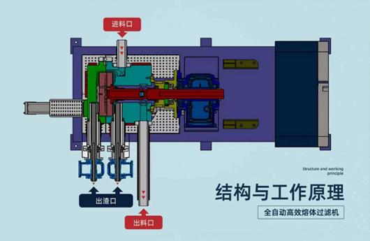 物料从入料口进入熔体腔,经过滤板过滤,不同目数合格的物料从出料口流出